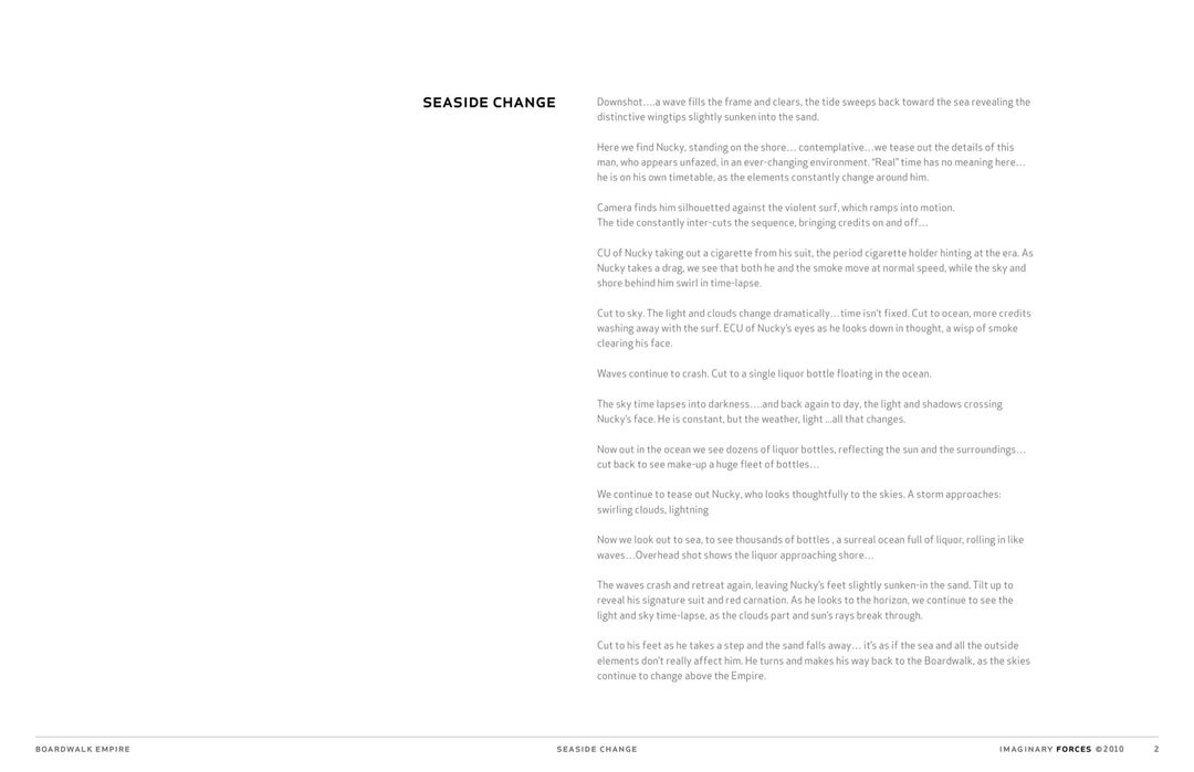 KF: Right. We thought that the idea of a message in a bottle – something coming, seeing your future – seemed very appropriate. But then we wondered, “What if the bottles literally are the storm?” In a meeting Tim van Patten drew a sketch of a little man looking out with hundreds of bottles coming at him. And so we ran with that surreal image, building a story around it. A man looks out to sea and sees his destiny, calmly watching the chaos roll in. Nucky’s the kind of character who, no matter what is thrown at him, is untouched by the storm. That’s why he’s not soaked at the end: he’s above it all – his shoes don’t get soiled.