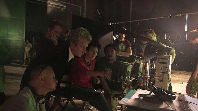 Rachel Talalay (center) directs on the set of Doctor Who with Peter Capaldi and crew.